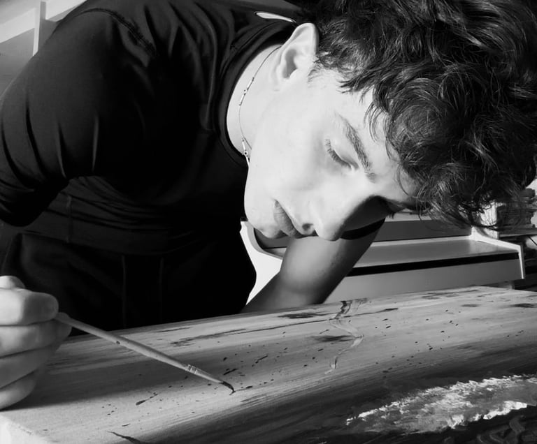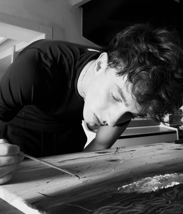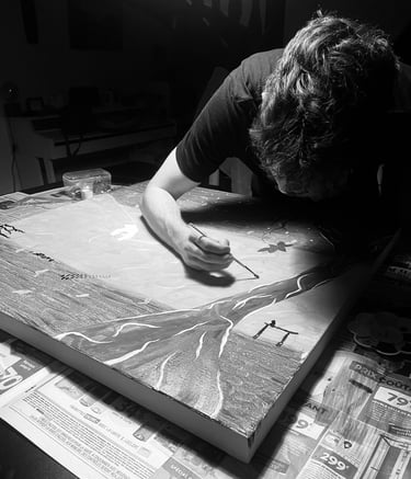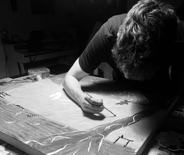 "Enchanté, je suis l'artiste aka Shawn BRUNET, ici, je peins certaines émotions et le récit d'aventures intérieures. Je ne m'inscris dans aucun courant particulier, l'intuition étant mon guide dans ce périple tumultueux. Chaque oeuvre est une création originale, un mélange de nostalgie, de calme et de mélancolie. Je laisse libre cours à l'interprétation de mes œuvres quitte à succomber sous le regard des autres."